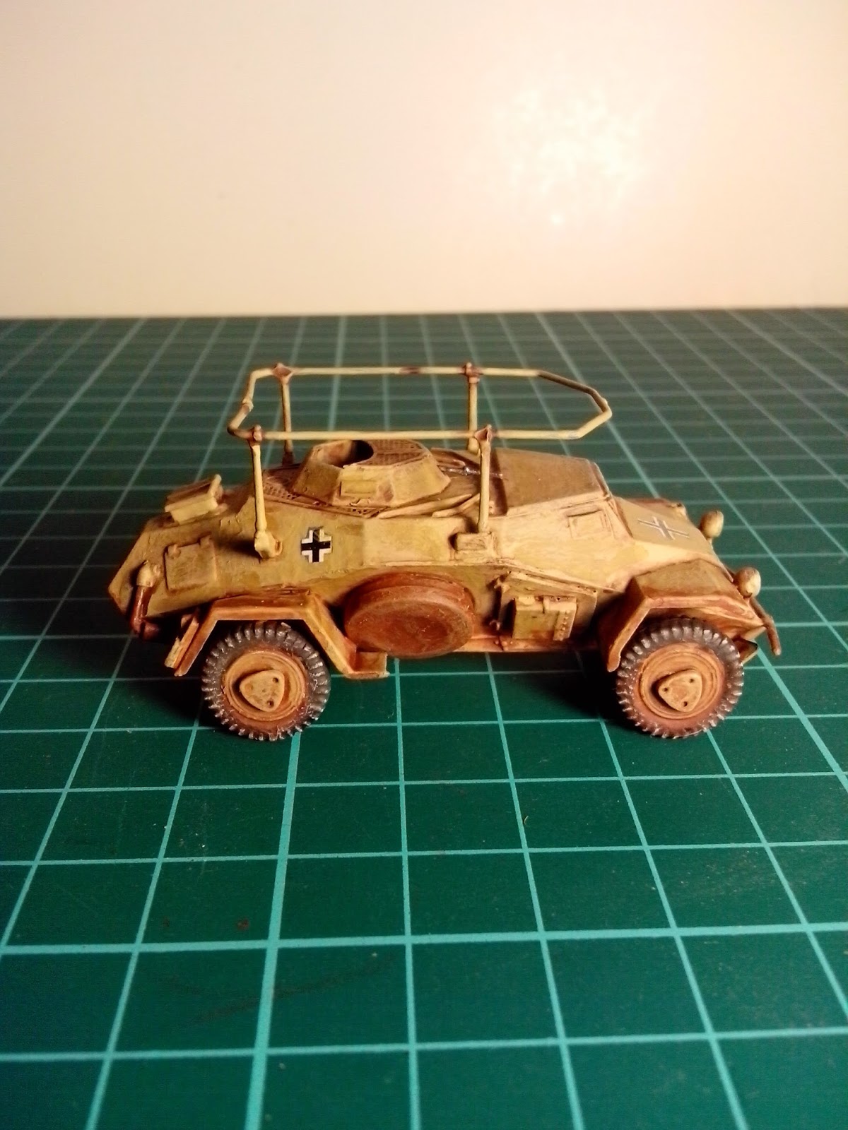 Покрасил модельку для немецкого штаба. Это лёгкий бронеавтомобиль Sd.Kfz.223. Он обладал радиостанцией среднего радиуса действия и применялся в разведывательных дивизионах. Вооружён был пулемётом MG 34 7,92 мм, экипаж 3 человека. Модель фирмы ICM. В "Rapid Fire" эту бронемашину можно использовать в разведке и в штабе кампфгруппы. Сделал машинку достаточно грязной и помятой, "уставшей" от фронтовых дорог, Нормандия, 1944 год.